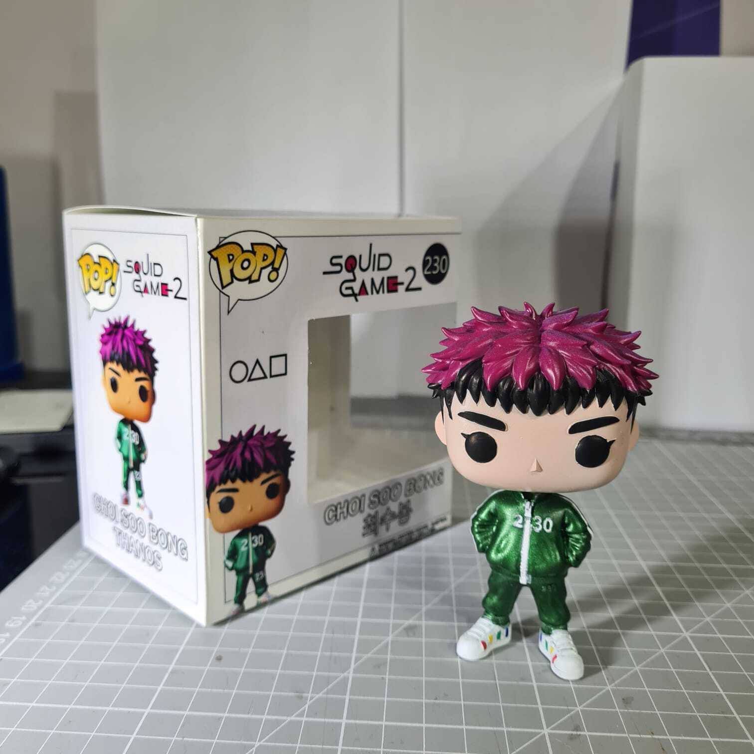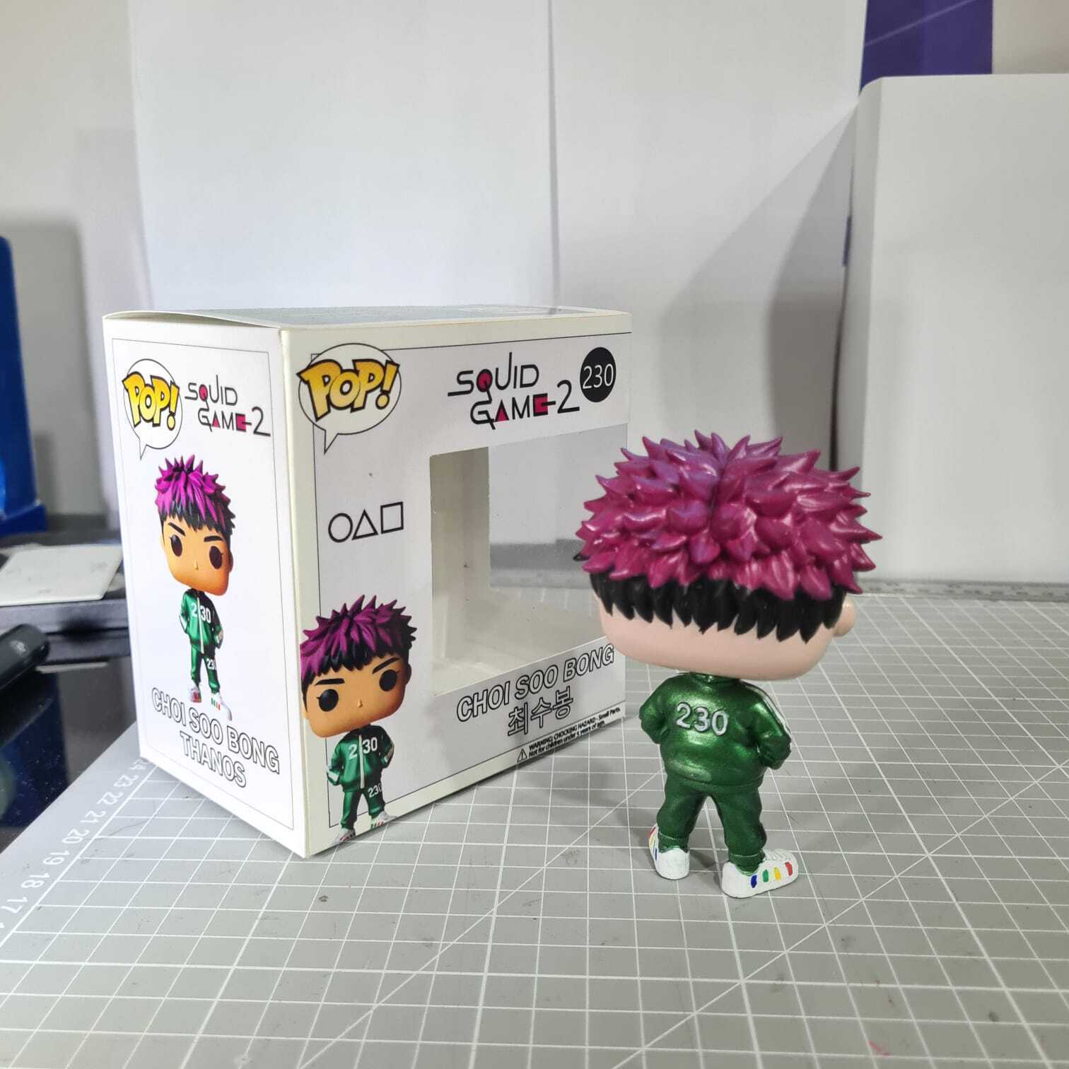 Thanos Funko Pop σε μοναδική fan art έκδοση εμπνευσμένη από τον χαρακτήρα Thanos / Player 230 του Squid Game Season 2. Με το μοβ μαλλί, έντονο βλέμμα και το αισθητικό στιλ που συνδυάζει το Squid Game με στοιχεία rap persona. Αυτή η φιγούρα ξεχωρίζει.