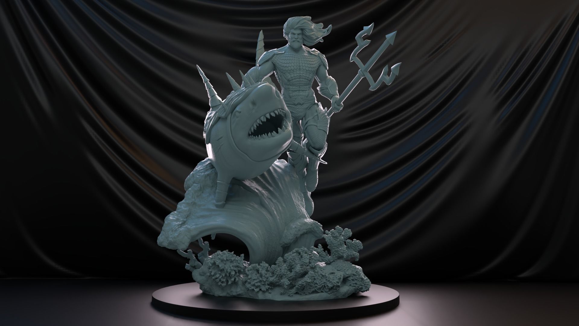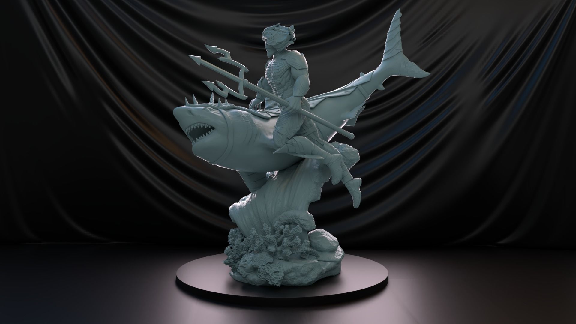 Ένα εντυπωσιακό diorama που απεικονίζει τον Aquaman σε όλη του τη θαλάσσια μεγαλοπρέπεια, καβάλα σε έναν τεράστιο καρχαρία με πανοπλία, καθώς ξεπηδούν μέσα από κύματα και πολύχρωμους κοραλλιογενείς σχηματισμούς. Ο βασιλιάς της Ατλαντίδας κρατά την εμβληματική του τρίαινα με αποφασιστικότητα, ενώ τα μαλλιά του ανεμίζουν δραματικά καθώς οδηγεί τη θάλασσα στη μάχη.