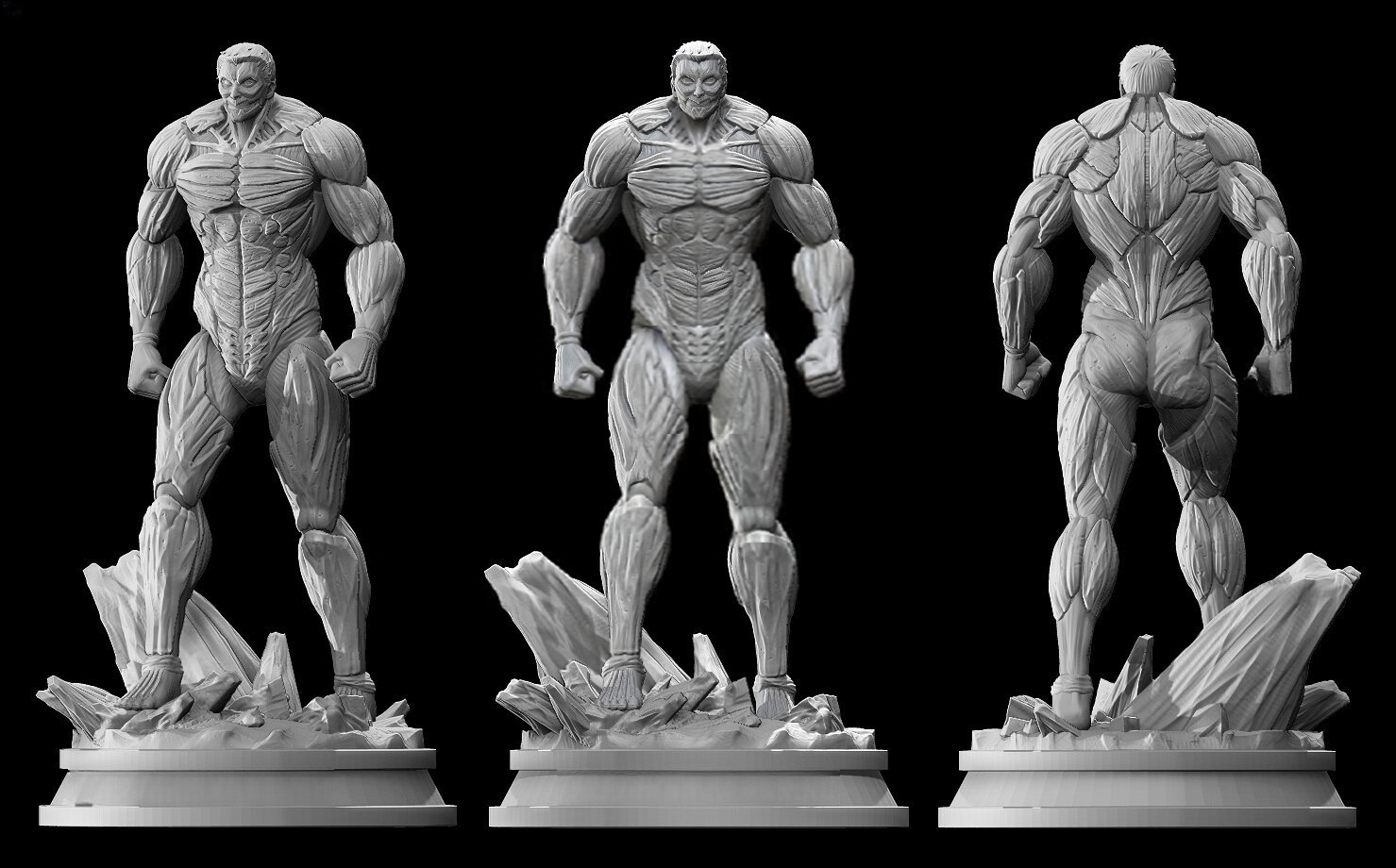 Η πόζα του είναι δυναμική και έτοιμη για μάχη, ενώ η βάση του απεικονίζει κατεστραμμένα ερείπια, σαν να έχει μόλις διαλύσει ένα τείχος – μια αναφορά στις πιο εμβληματικές του σκηνές. Οι έντονες αντιθέσεις στις αποχρώσεις των μυών και της θωράκισης ενισχύουν τον δραματικό χαρακτήρα του αγάλματος.