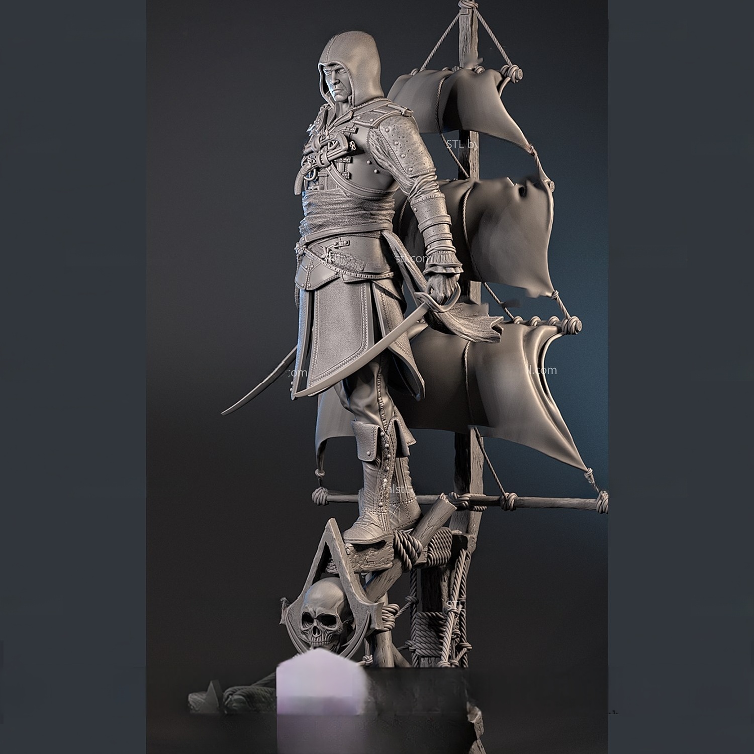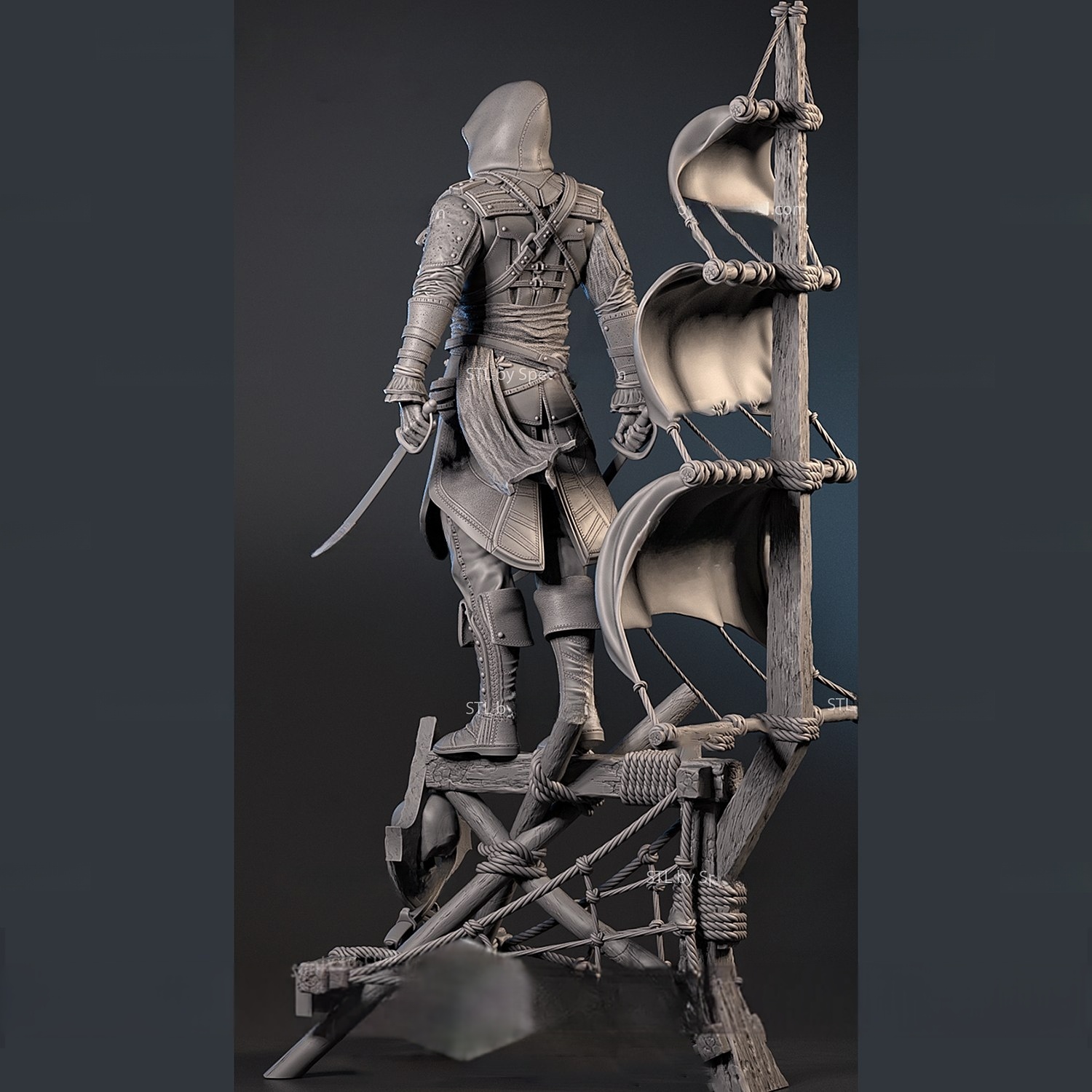 Η φιγούρα στέκεται επιβλητικά επάνω σε ένα κομμάτι καραβιού με πανιά και σύμβολα των Assassins, ενώ ο ίδιος κρατά έτοιμα τα σπαθιά του, αποπνέοντας πολεμική ετοιμότητα και αποφασιστικότητα. Είναι μια σύνθεση που ενώνει την πειρατική δράση με την μυστικότητα και την τιμή των Assassins.