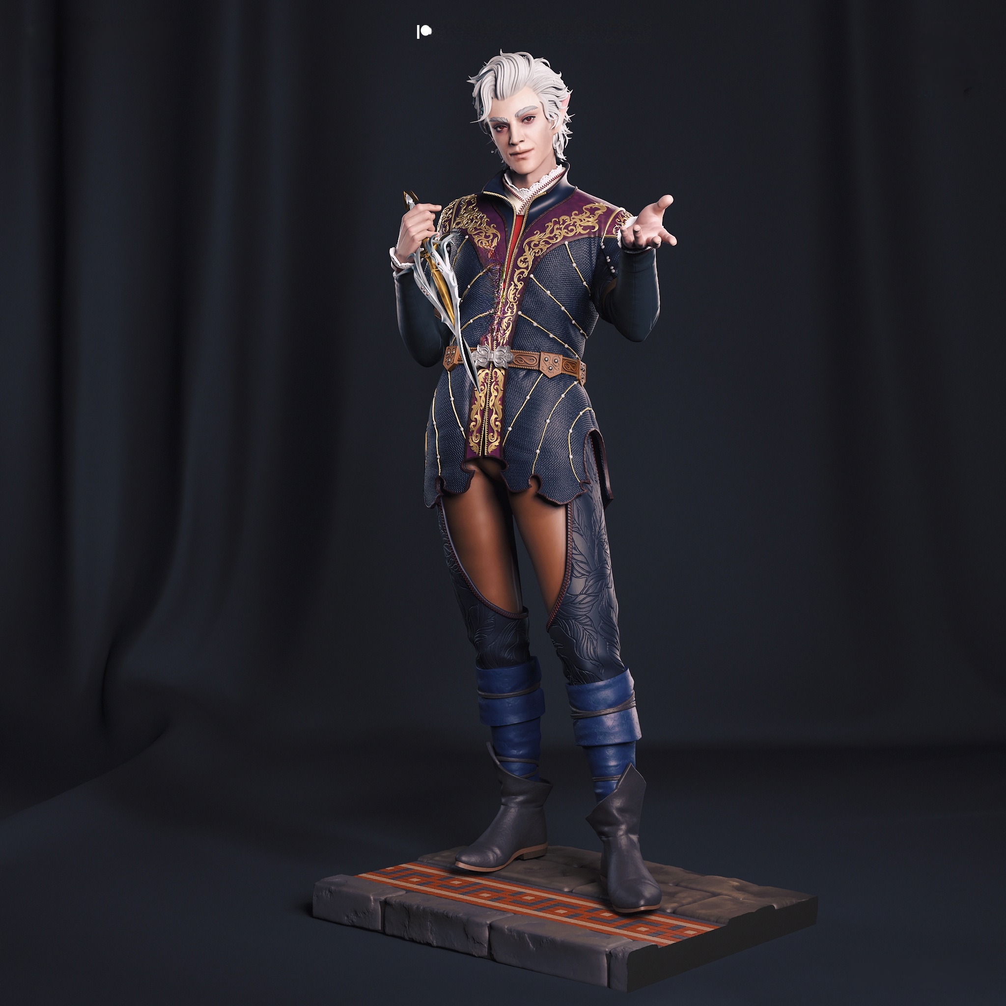 Η ενδυμασία του συνδυάζει βαθύ βυσσινί, χρυσά κεντήματα και λεπτομέρειες που αναδεικνύουν την νυχτερινή του γοητεία και την επικίνδυνη κομψότητά του. Στο ένα χέρι κρατάει ένα περίτεχνο στιλέτο, ενώ το άλλο απλώνεται σαν να σε προσκαλεί – ή να σε παγιδεύει.