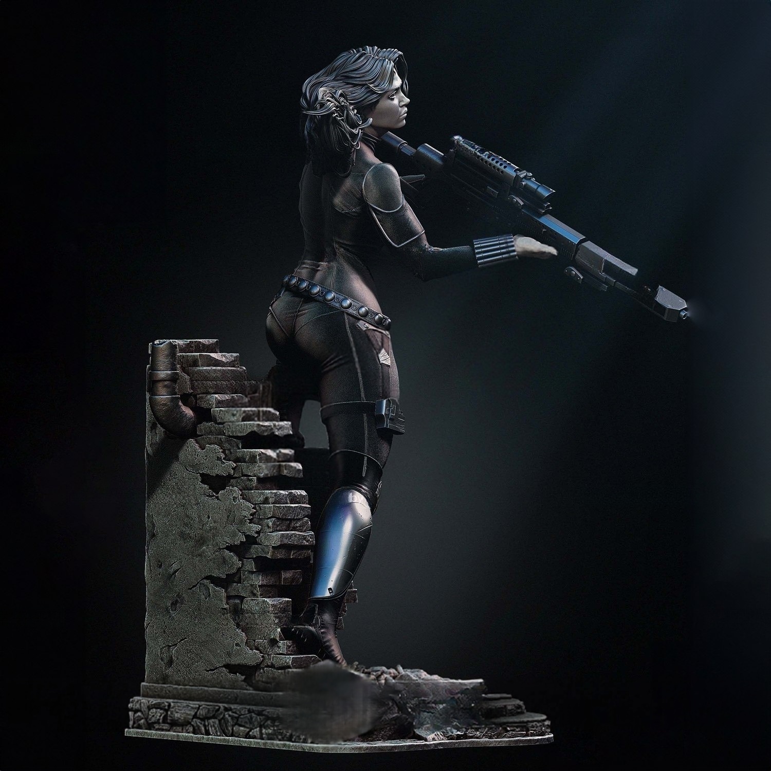 Η χαρακτηριστική μαύρη stealth στολή της είναι γεμάτη λεπτομέρειες, με ρεαλιστικά paneling, tactical ζώνες και kneepads, προσδίδοντας απόλυτο ρεαλισμό στην παρουσία της.