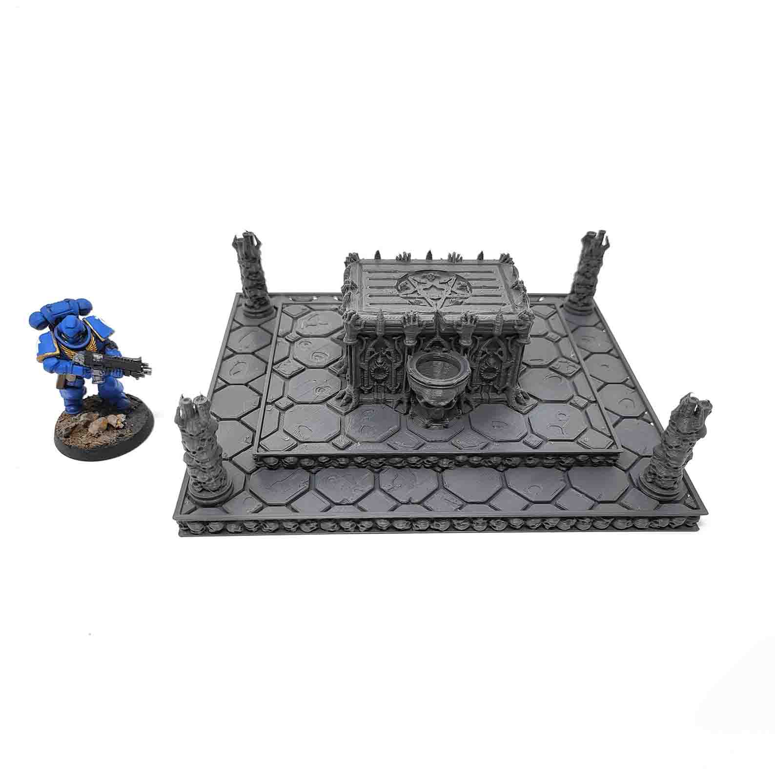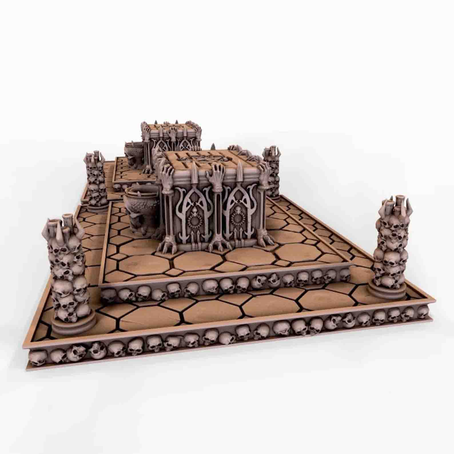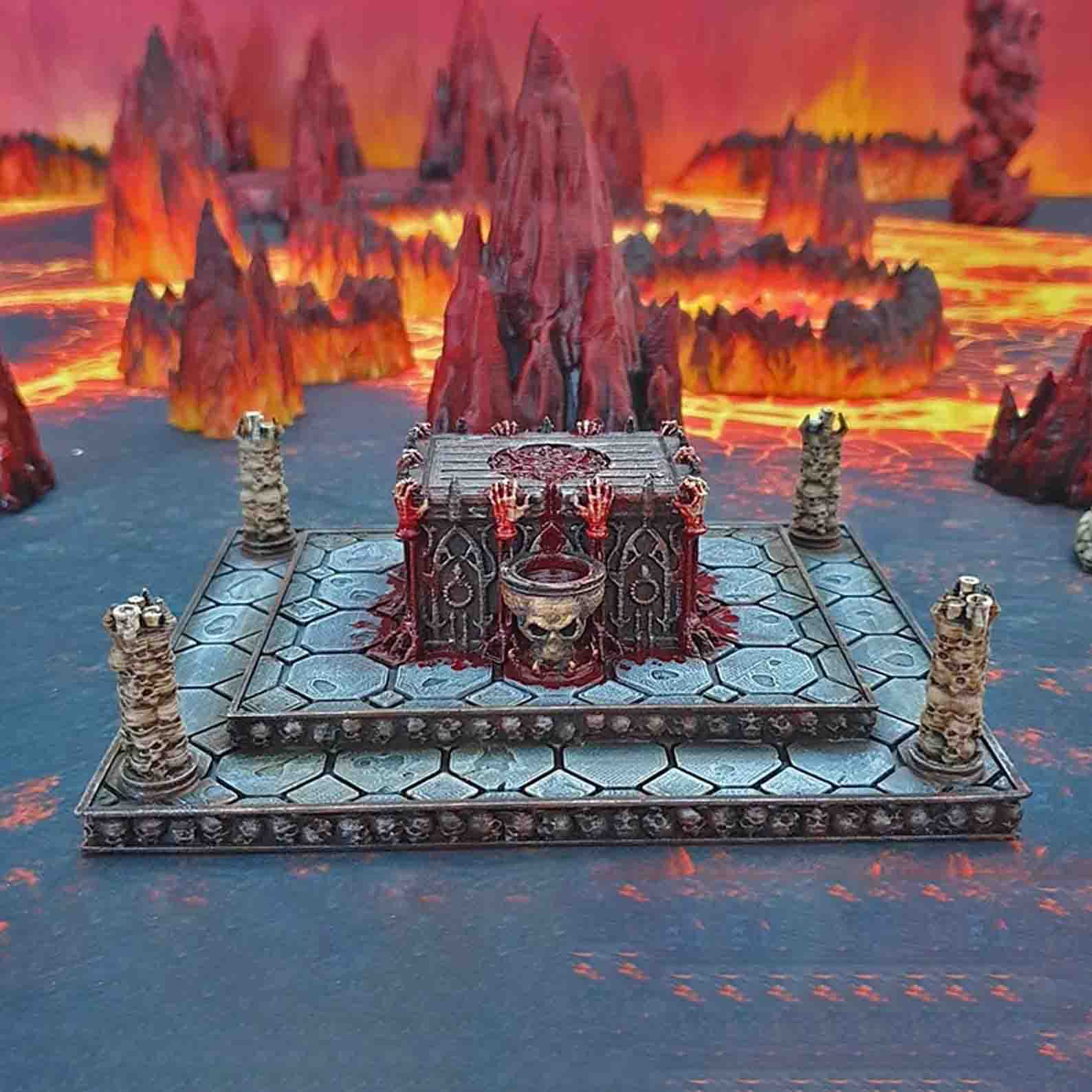 Το Bloody Sacrificial Altar είναι ένα εντυπωσιακό miniature terrain piece για Dungeons & Dragons καθώς και κάθε dark fantasy παιχνίδι. Ο βωμός δημιουργεί αμέσως την αίσθηση ενός αρχαίου, απαγορευμένου τελετουργικού. Ενώ η σκηνή περιλαμβάνει ανασηκωμένα χέρια, κρανία και λεπτομέρειες που θυμίζουν ξεχασμένο ναό γεμάτο αίμα και σκοτάδι.