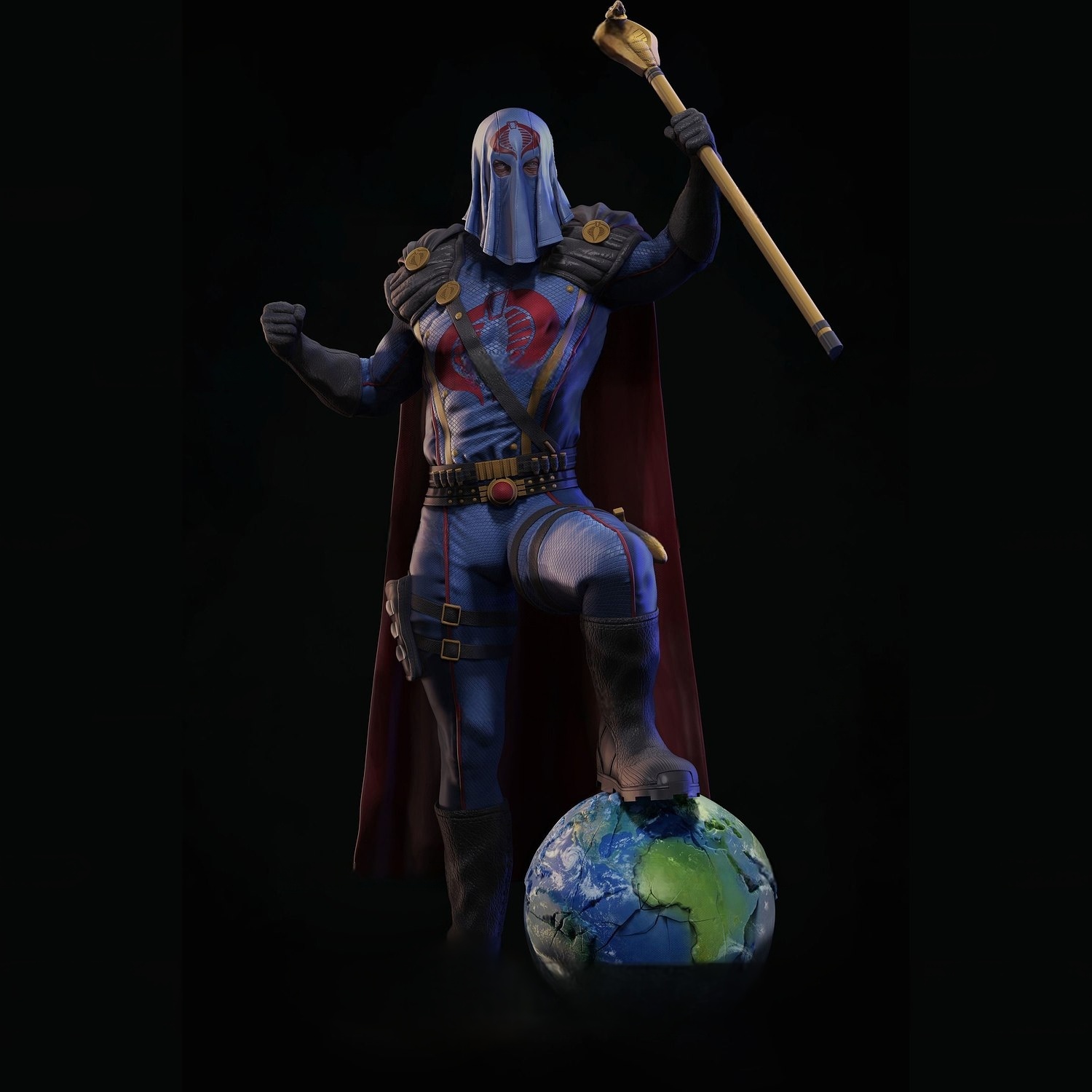 Ο απόλυτος ηγέτης της Cobra επιστρέφει μέσα από μια εντυπωσιακή fan art φιγούρα που αποτυπώνει τη δίψα του για παγκόσμια κυριαρχία! Ο Cobra Commander, με τη χαρακτηριστική μπλε στολή του, την κόκκινη κάπα και τη μεταλλική του μάσκα, στέκεται με το ένα πόδι επάνω στον πλανήτη, δηλώνοντας πως ο κόσμος είναι ήδη δικός του.