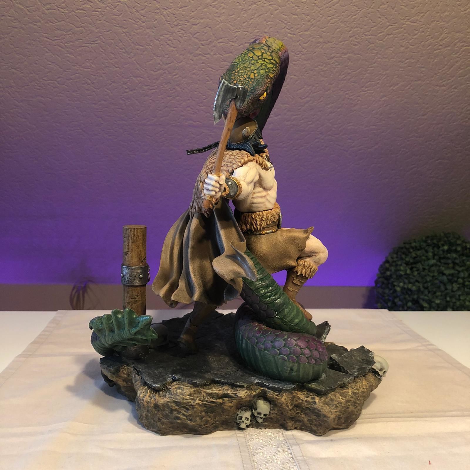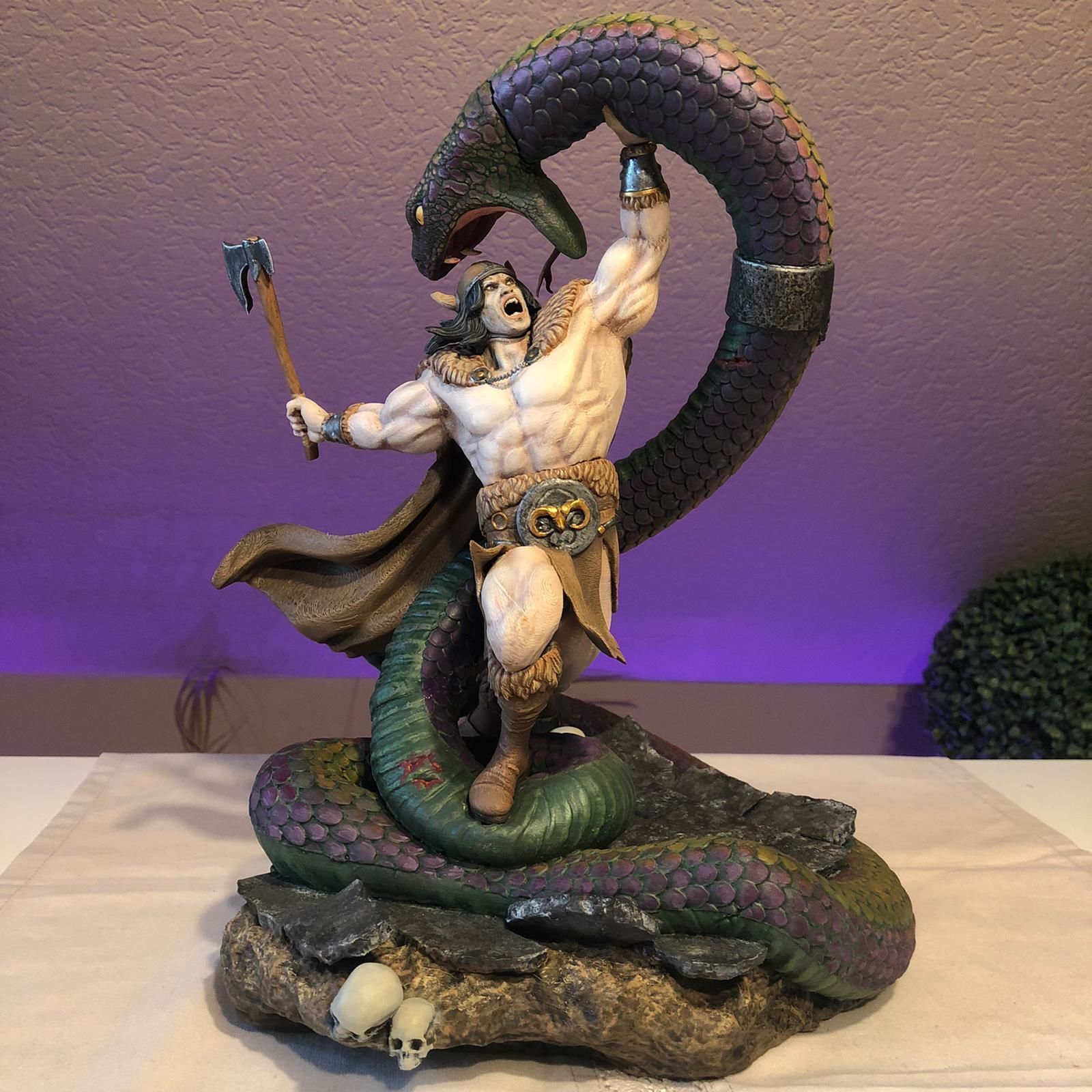 Το Conan the Barbarian diorama δείχνει τον θρυλικό βάρβαρο σε ένα επικό στιγμιότυπο μάχης με ένα τεράστιο φίδι να στροβιλίζεται γύρω του.