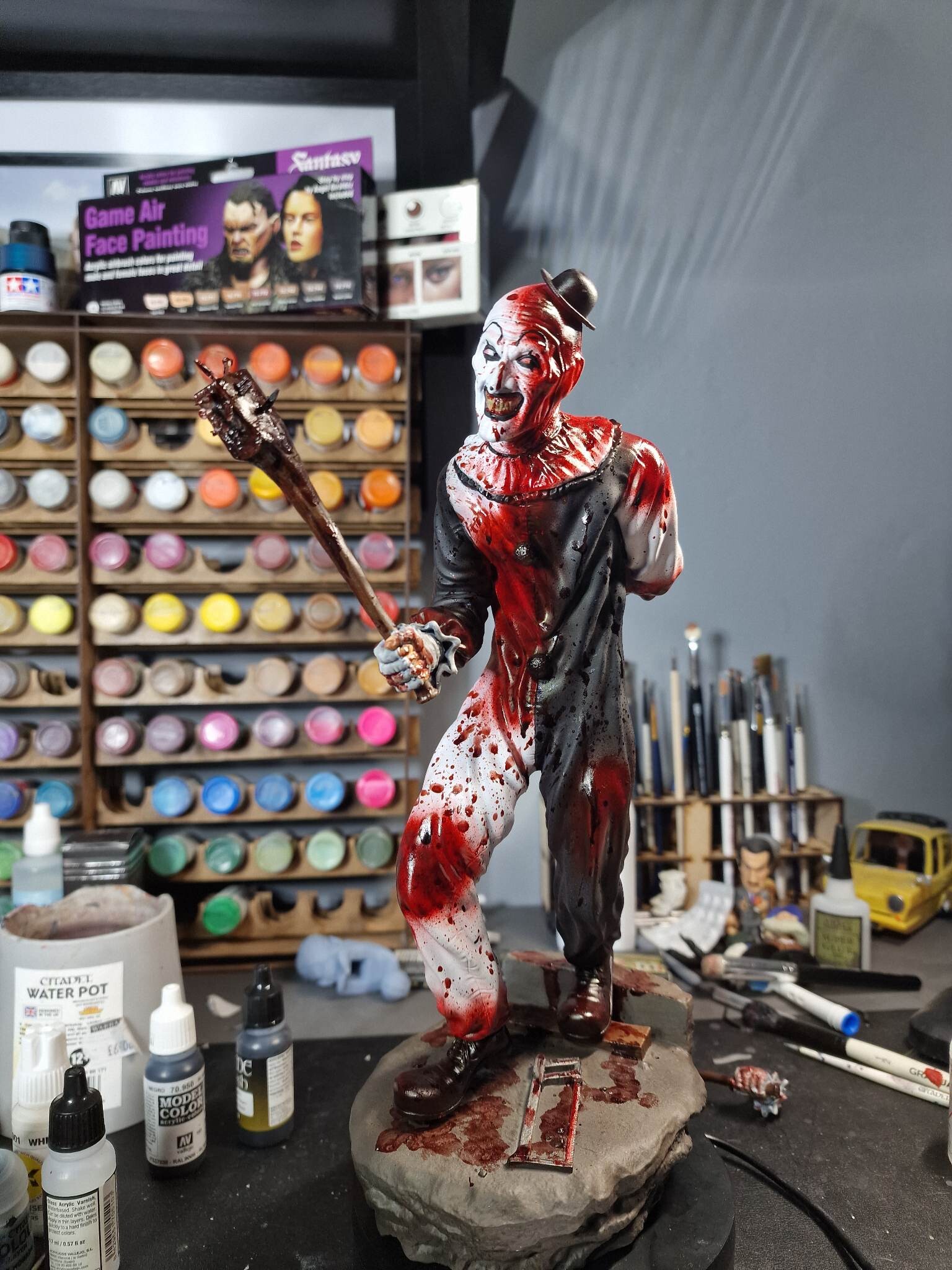 Ο τρομακτικός κλόουν από το Terrifier ζωντανεύει με αυτή τη φρικιαστικά λεπτομερή fan art συλλεκτική φιγούρα. Ο Art the Clown αποτυπώνεται με το μοχθηρό του χαμόγελο, το αιματοβαμμένο του μαχαίρι και το αυτοσχέδιο ρόπαλο με καρφιά, αποπνέοντας απόλυτη παράνοια και τρόμο – ακριβώς όπως στην cult horror ταινία.