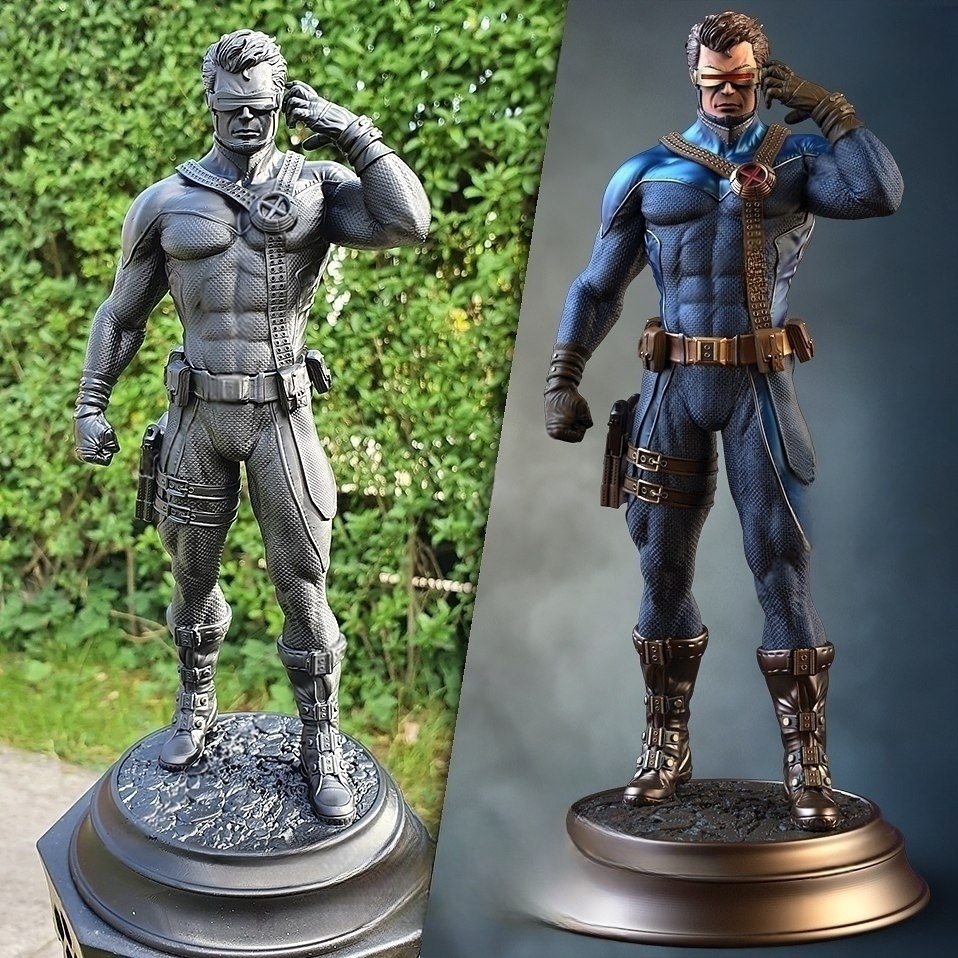 Ο ηγέτης των X-Men, Cyclops, παρουσιάζεται σε μια επιβλητική στάση ετοιμότητας, με το χέρι στο visor του, έτοιμος να απελευθερώσει τη δύναμη του οπτικού του ακτινοβολίου. Η στολή του σε σκούρες μπλε αποχρώσεις με λεπτομέρειες σε δέρμα και χρυσό αναδεικνύει τον κλασικό σχεδιασμό του χαρακτήρα, αποπνέοντας κύρος και δύναμη.
