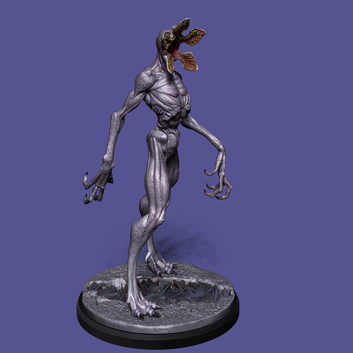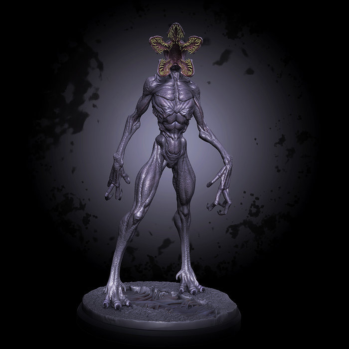 Με το ανθοειδές του κεφάλι διάπλατα ανοιχτό και το δέρμα του να αποπνέει μια οργανική, εξωγήινη υφή, το πλάσμα αποπνέει ωμή δύναμη και αγριότητα. Η επιβλητική του στάση, τα παραμορφωμένα άκρα και η λεπτομερής βάση με ίχνη θηράματος μετατρέπουν τη φιγούρα σε ένα γλυπτό τρόμου και αναφοράς στο σύμπαν του Stranger Things.