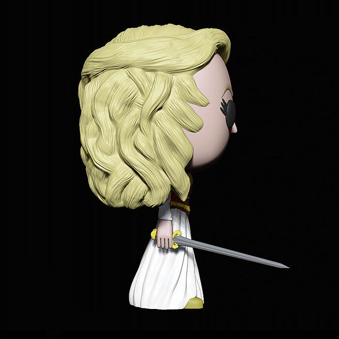 Η φιγούρα Eowyn of Rohan Funko pop, παρουσιάζει την Eowyn να υιοθετεί μια μαχητική εμφάνιση (Battle Dress) στην πιο δυναμική fan art εκδοχή της. Φορεί πανοπλία μάχης, με ροδοκόκκινο μανδύα να κυματίζει, κρατά το σπαθί της με σταθερό βλέμμα και εκπέμπει αποφασιστικότητα και θάρρος. Η βάση της φιγούρας μπορεί να έχει πετρώματα και στοιχεία μάχης εμπνευσμένα από τις πεδιάδες της Μίνες Τίριθ ή της Ρόχαν.