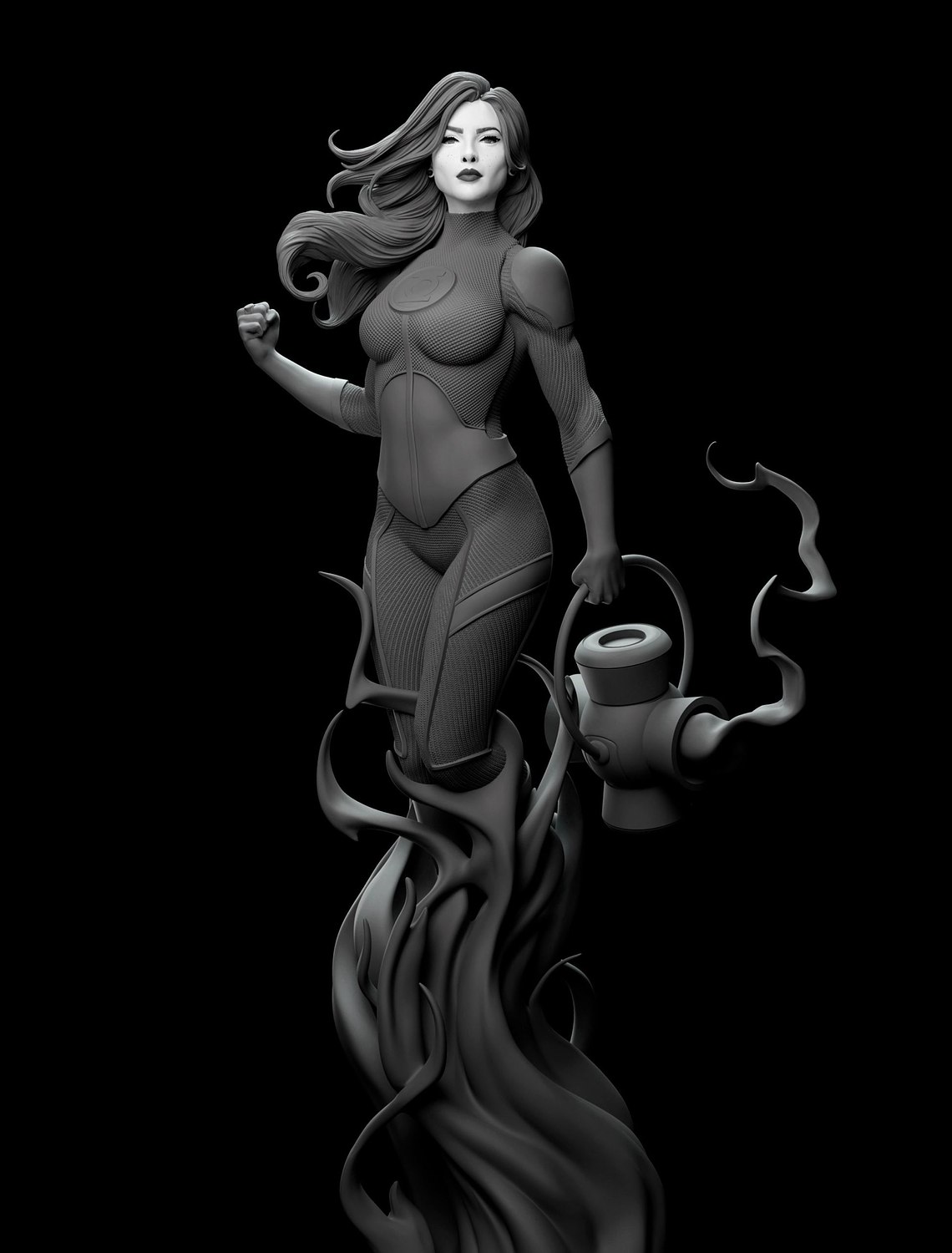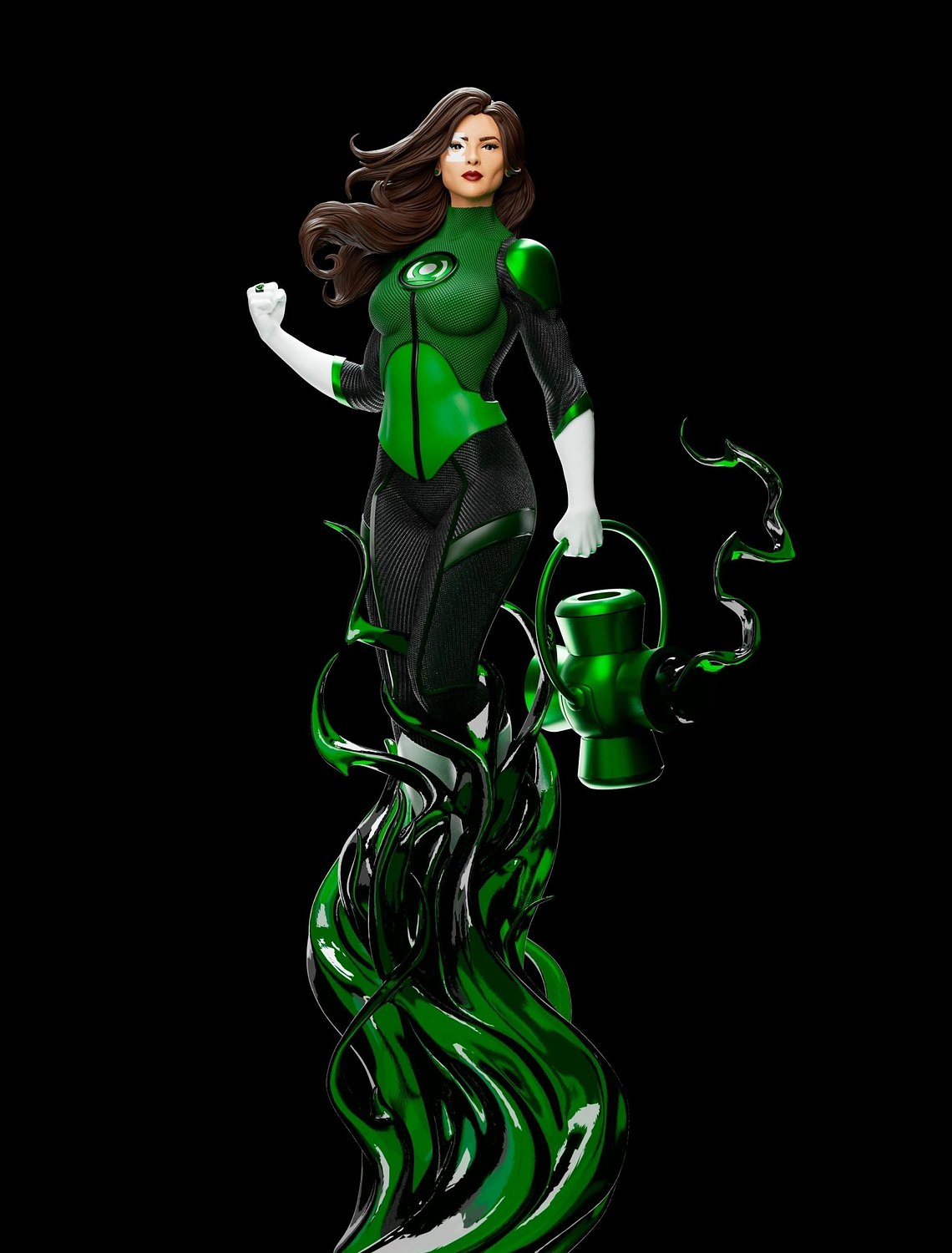 Η φιγούρα την απεικονίζει με αυτοπεποίθηση, καθώς αιωρείται μέσα σε σμαραγδένια ενέργεια που ξεπηδά από το Power Ring και το φανάρι της, αναδεικνύοντας την ισχύ και τη σύνδεσή της με το Green Lantern Corps. Η στολή της, με φουτουριστικό ύφος και κομψό σχεδιασμό, συνδυάζει μεταλλικά πράσινα και μαύρα στοιχεία, δίνοντας έμφαση στην ηρωική της παρουσία.