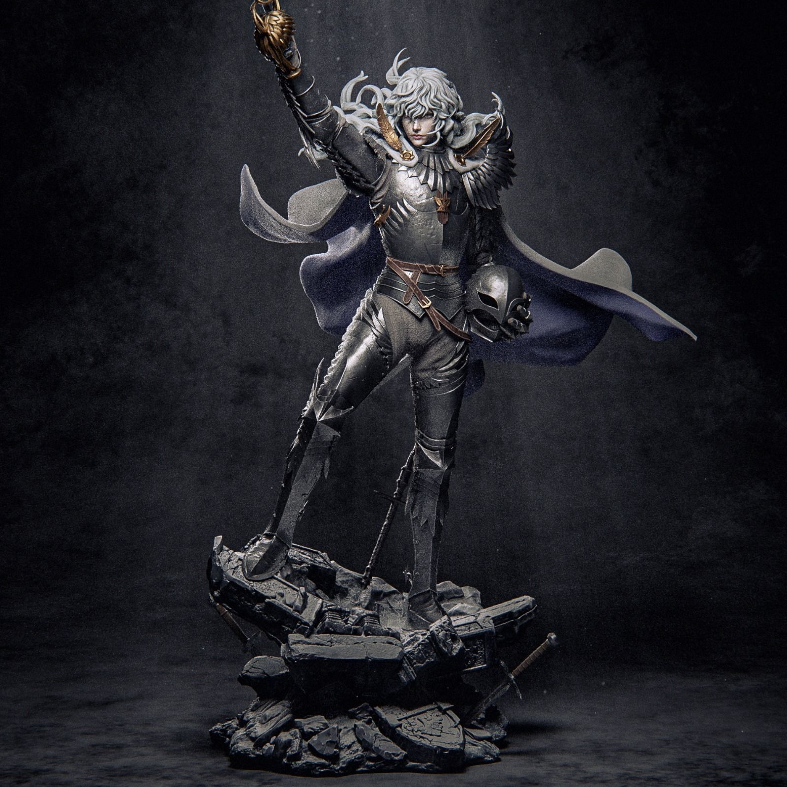 Ο χαρισματικός και αμφιλεγόμενος Griffith από το Berserk δεσπόζει επιβλητικά σε αυτή τη fan art φιγούρα, απεικονισμένος τη στιγμή που σηκώνει το φλεγόμενο Behelit, προμηνύοντας τη μοίρα που θα ακολουθήσει. Φορώντας την αστραφτερή πανοπλία του και με τον μανδύα να κυματίζει δυναμικά πίσω του, η φιγούρα αποπνέει αίγλη, εξουσία και μυστήριο.