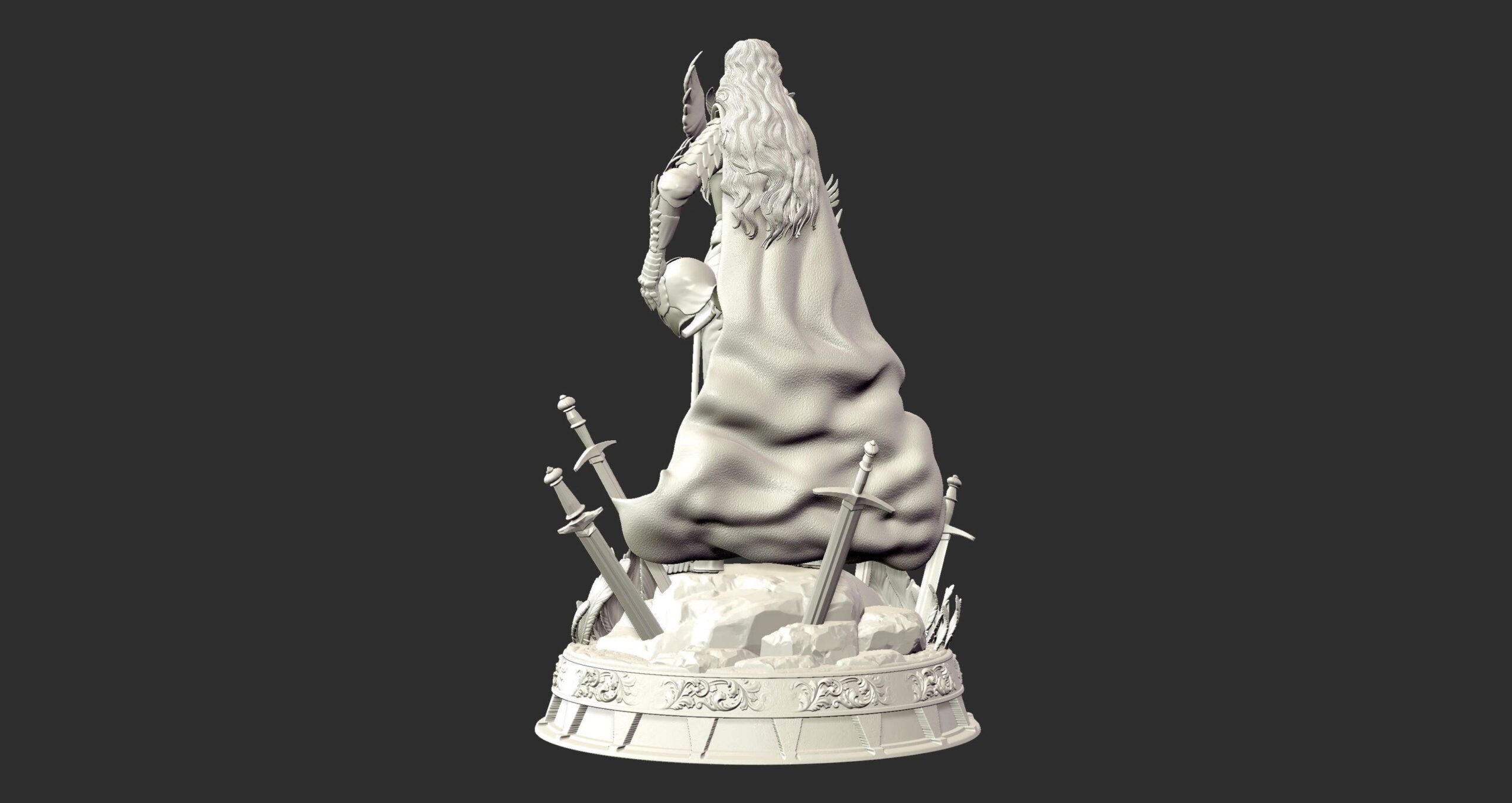 Η φιγούρα αποπνέει αριστοκρατική χάρη, ενώ το σκηνικό με τα φτερά, τα σπαθιά και το ανάγλυφο βάθρο, αποδίδει τη συμβολική του πορεία ως σωτήρας ή καταστροφέας. Στο ένα χέρι κρατά την περικεφαλαία του, και στο άλλο το σπαθί του, έτοιμος να διαβεί τον δρόμο του πεπρωμένου.