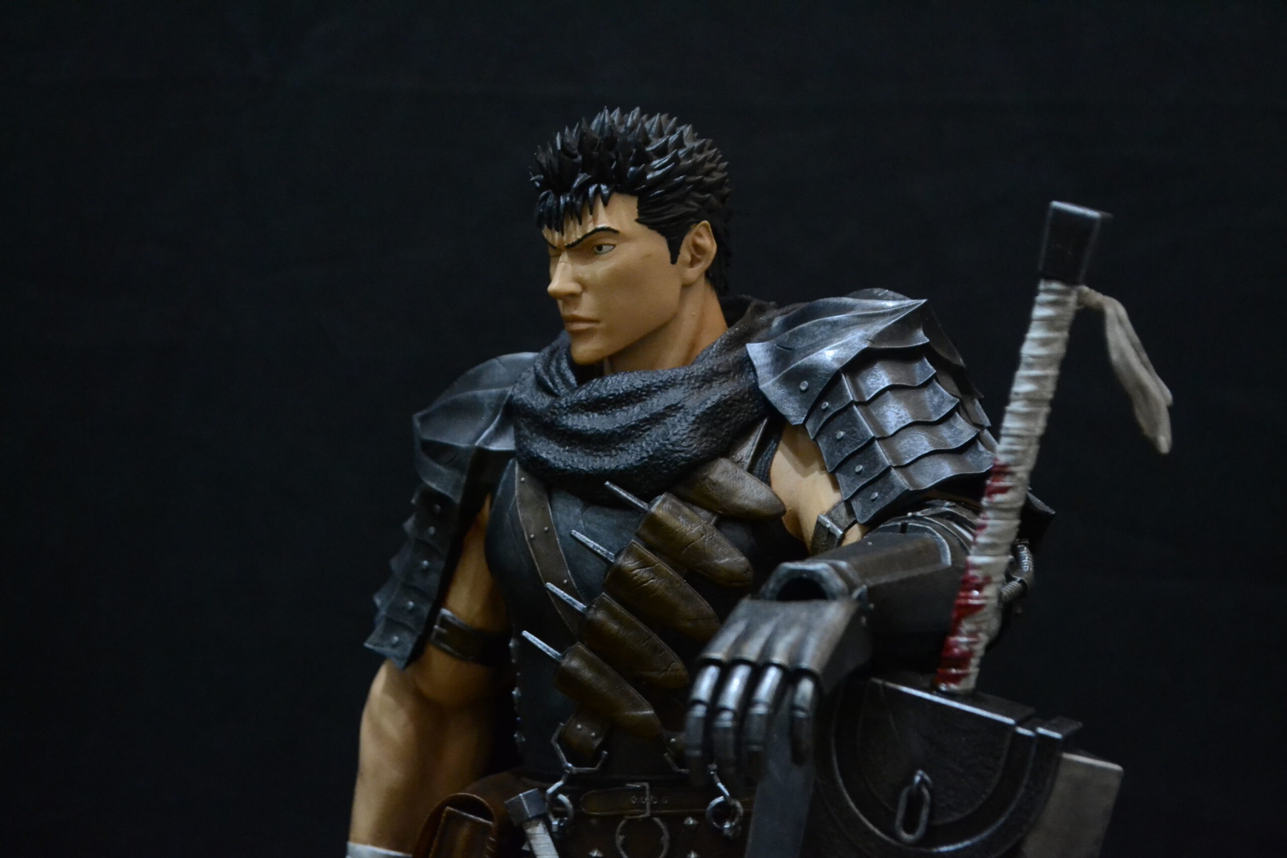 Η πανοπλία του, γεμάτη φθορές, και το αιματοβαμμένο του χέρι αποδίδουν την ασταμάτητη μάχη του Guts ενάντια στη μοίρα, στους αποστρόφους και στα ίδια του τα τραύματα.