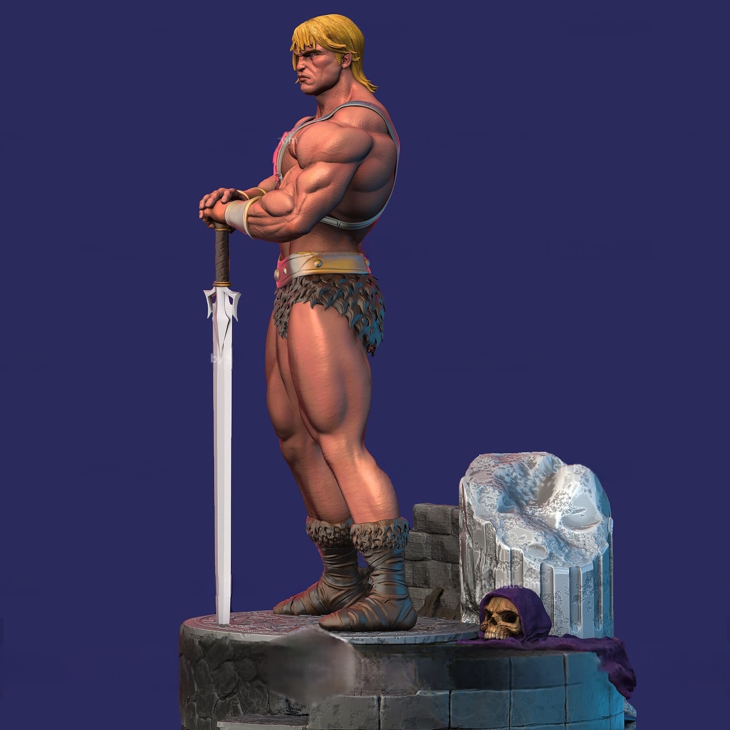 Ο He-Man παρουσιάζεται εδώ σε μία από τις πιο επιβλητικές και σοβαρές στάσεις του, σαν αληθινός θρύλος της Eternia. Στέκεται αγέρωχος πάνω σε πετρώδη βάση, με το σπαθί της δύναμης σταθερά μπροστά του, αποπνέοντας σεβασμό, ηγετική ισχύ και απόλυτη αποφασιστικότητα.