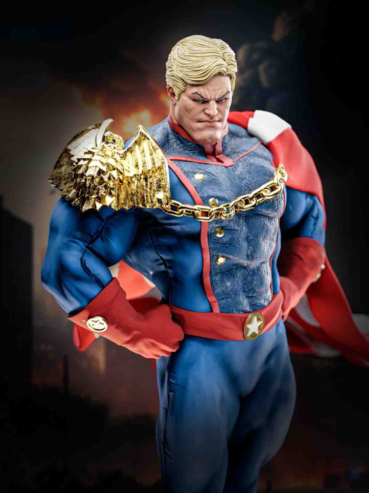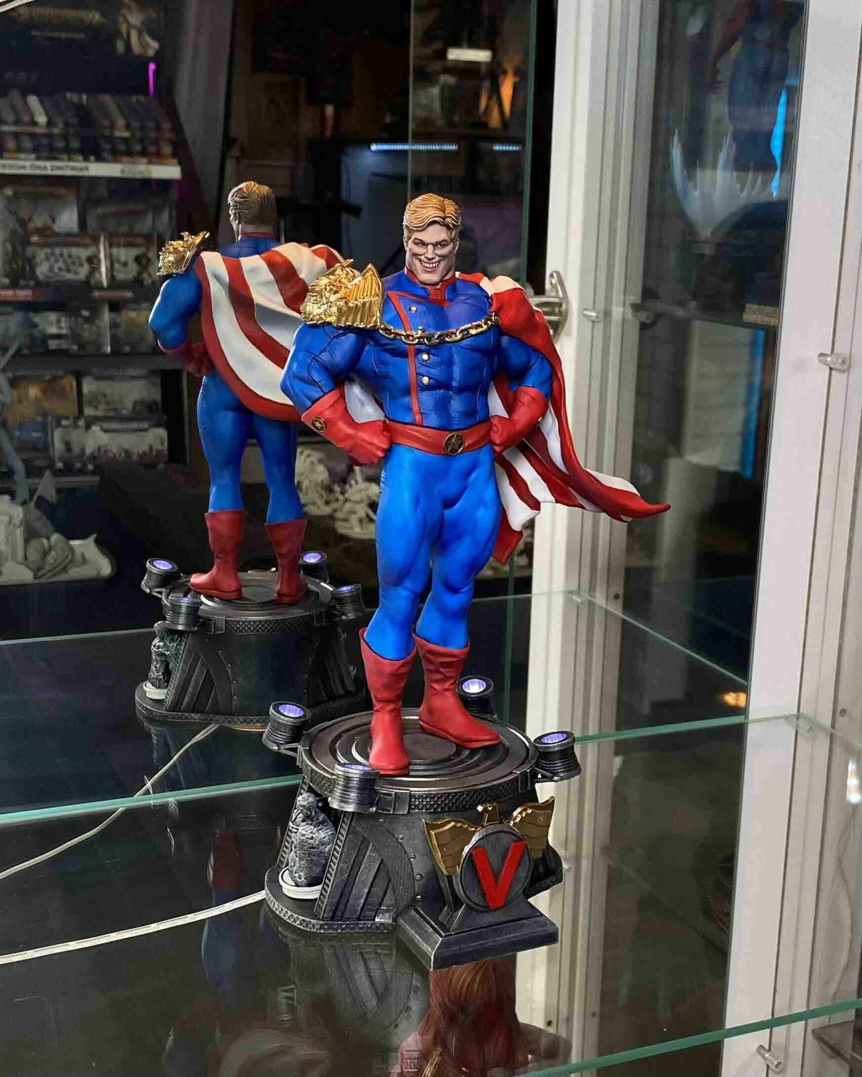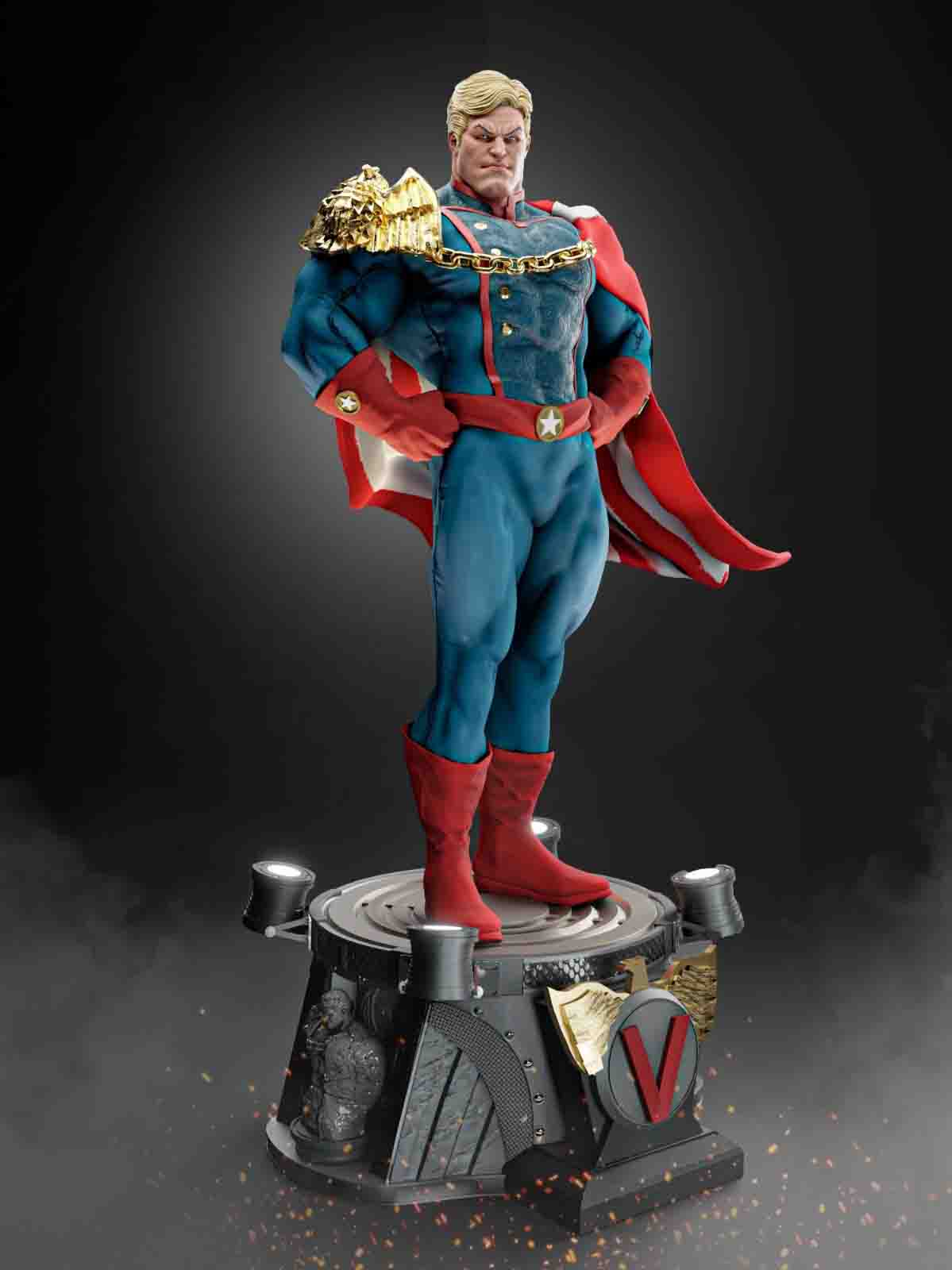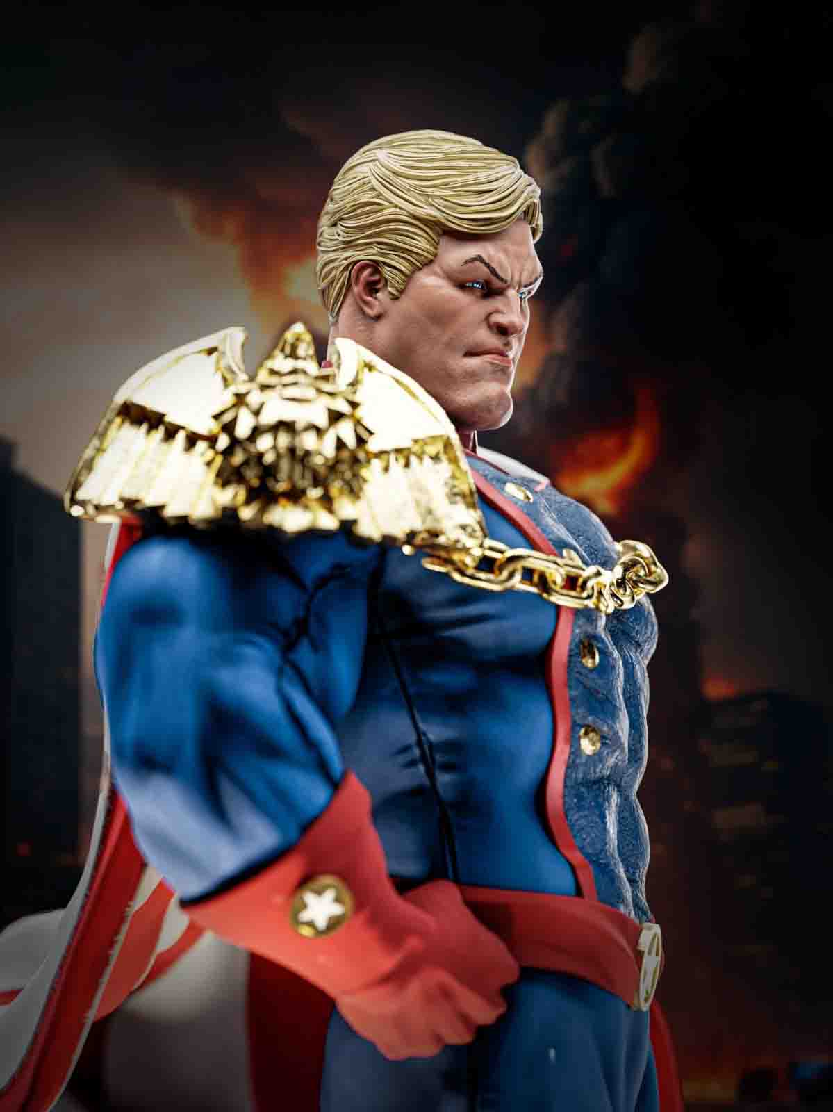 Το Homelander comic statue αποτελεί μια φιγούρα του Homelander από το comic universe του The Boys. Αναδεικνύει την ακραία αυταρχική παρουσία του πιο επικίνδυνου “ήρωα”. Η στάση του με τα χέρια στους γοφούς και το υπεροπτικό βλέμμα αποπνέουν απόλυτη κυριαρχία. Η στολή του είναι πιστή στην comic εκδοχή, με βαθύ μπλε σώμα, κόκκινα γάντια και μπότες. Ενώ η εντυπωσιακή κάπα με εσωτερικές ρίγες ανεμίζει. Το diorama base περιλαμβάνει λεπτομέρειες όπως προβολείς, μεταλλικές υφές αλλά και το χαρακτηριστικό έμβλημα της Vought. Δημιουργώντας έτσι ένα ολοκληρωμένο σκηνικό δύναμης αλλά και πολιτικής προπαγάνδας.