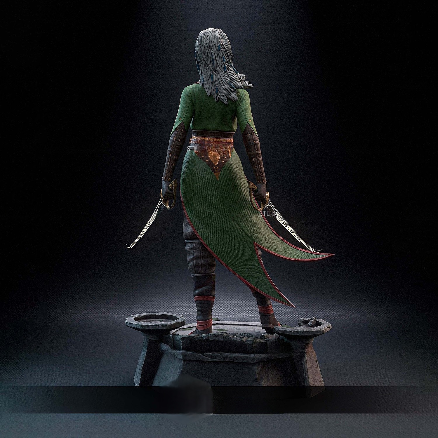 Με τα δίδυμα λεπίδια στα χέρια της και βλέμμα αποφασισμένο, στέκεται έτοιμη να προστατεύσει τη φύση και τους συμμάχους της. Η στολή της, εμπνευσμένη από το σμαραγδένιο τάγμα και τις Harper καταβολές της, αναδεικνύεται με χρυσές λεπτομέρειες και ελαφριά πανοπλία που συνδυάζει κομψότητα και μάχη.