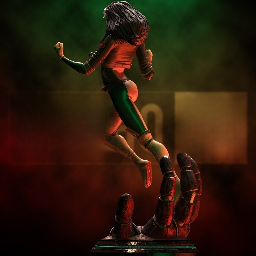 Η Rogue, μία από τις πιο αγαπημένες μεταλλαγμένες των X-Men, αποτυπώνεται εδώ σε μια επιβλητική και ταυτόχρονα κομψή στάση, καθώς αιωρείται πάνω από το μηχανικό χέρι ενός Sentinal. Η κλασική της πράσινο-κίτρινη στολή με το δερμάτινο μπουφάν και τη λευκή τούφα στα μαλλιά αποδίδεται με μοναδική λεπτομέρεια, αποπνέοντας αυτοπεποίθηση και δυναμισμό.