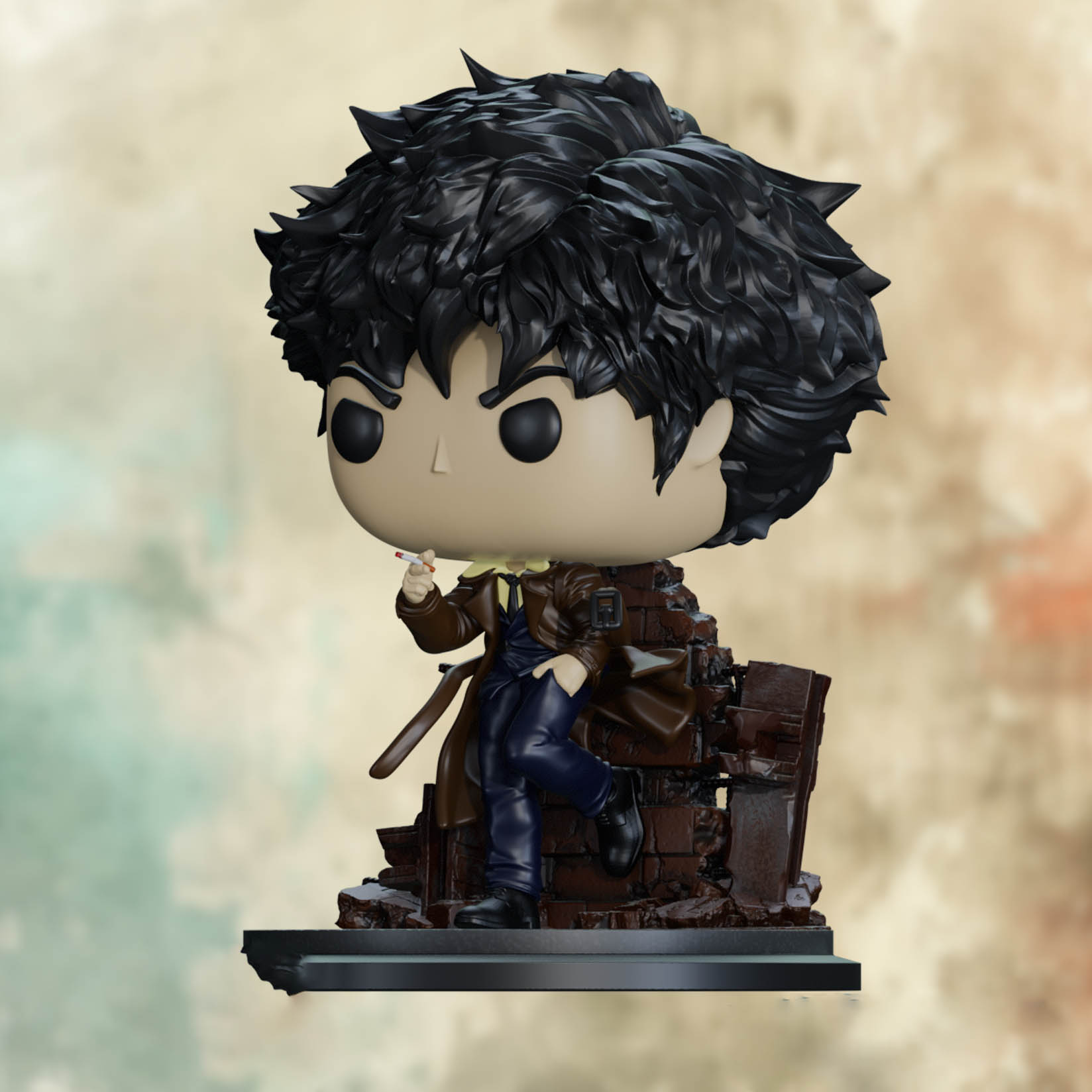Spike Spiegel Funko Pop σε μορφή “Last Stand Bebop”. Mια συγκλονιστική fan art έκδοση που αποδίδει τον θρυλικό bounty hunter σε μια δραματική σκηνή μάχης. Με ρούχα ταλαιπωρημένα, καπνό και σκόνη στο background. Tο πιστόλι του στο χέρι και βλέμμα που αντανακλά την αποφασιστικότητα. Aυτή η φιγούρα αντικατοπτρίζει το ύφος του Cowboy Bebop σε υψηλή τέχνη.
