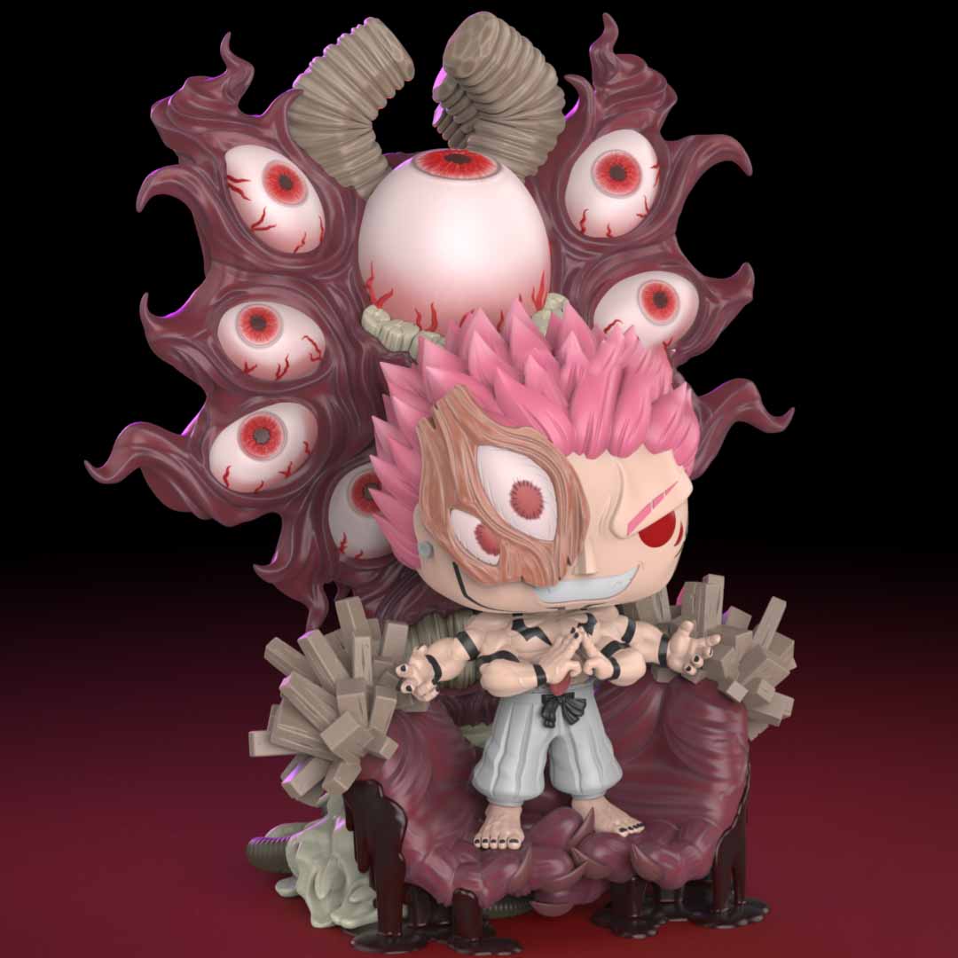Ο Sukuna Culling Games Custom Pop [Fan Art Edition] αναπαριστά τον Βασιλιά των Καταρών σε μια από τις πιο τρομακτικές μορφές του από το Jujutsu Kaisen. Η φιγούρα βασίζεται στη σκηνή της Domain Expansion του Sukuna κατά τη διάρκεια των Culling Games, με τον ίδιο να κάθεται σε έναν οργανικό θρόνο που θυμίζει σάρκα και μάτια, εκπέμποντας απόλυτη απειλή, καθώς αποτυπώνει τη θεϊκή αγριότητα και τον αδιανόητο τρόμο που προκαλεί ο βασιλιάς των καταρών.
