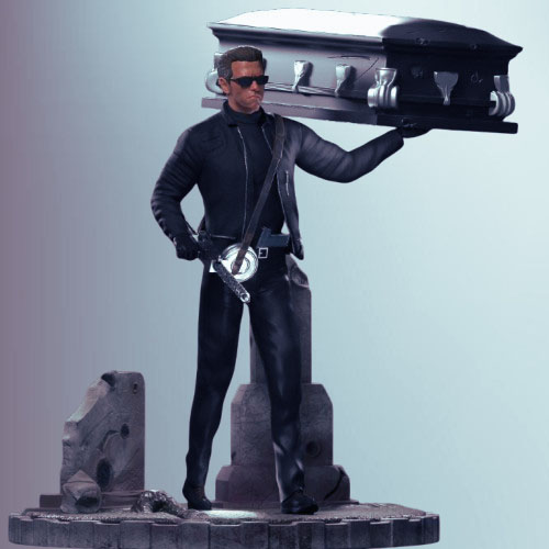 Το T-800 Terminator Diorama φέρνει στη ζωή μία από τις πιο έντονες σκηνές του Terminator 3: Rise of the Machines (2003). Ο Arnold Schwarzenegger, στον ρόλο του T-800, εμφανίζεται με το κλασικό του δερμάτινο μπουφάν. Tα μαύρα γυαλιά και το εμβληματικό φέρετρο γεμάτο όπλα. Το diorama αποτυπώνει τη δύναμη και την επιβλητική του παρουσία.