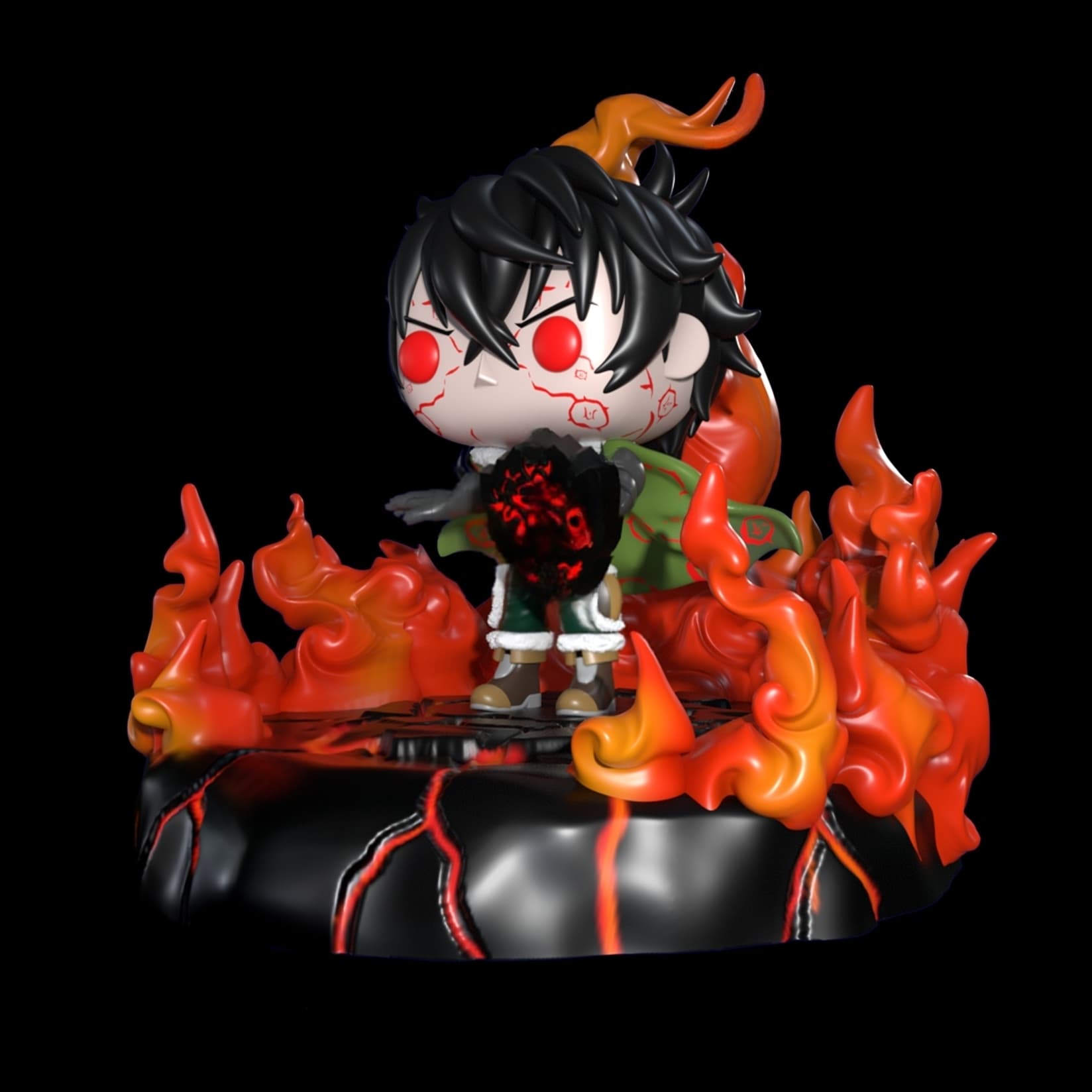 Naofumi Funko Pop στην εντυπωσιακή μορφή Cursed Flame Form, αποδίδει τον ήρωα καθισμένο σε θρόνο από λάβα και φλόγες. Mε τα μάτια του να λάμπουν κόκκινα και το καταραμένο του ασπίδιο να εκπέμπει σκοτεινή ενέργεια. Οι φλόγες περιβάλλουν τη βάση και ενισχύουν τη σκηνή οργής και απόλυτης δύναμης.