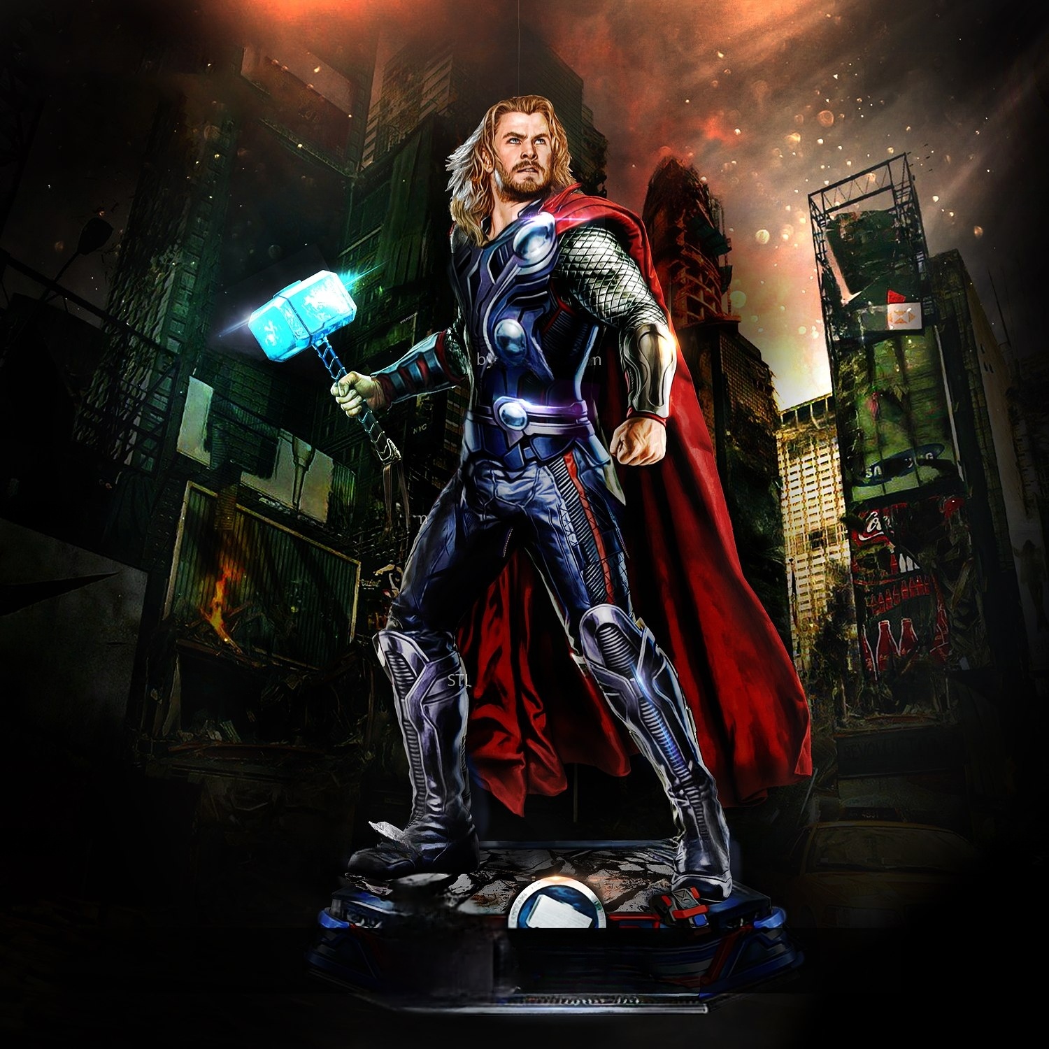Η φιγούρα αποτυπώνει τον Thor σε ετοιμότητα μάχης στο πεδίο της Νέας Υόρκης, με τη βάση να παραπέμπει σε κατεστραμμένο αστικό τοπίο, θυμίζοντας τις σκηνές της θρυλικής μάχης εναντίον των Chitauri.