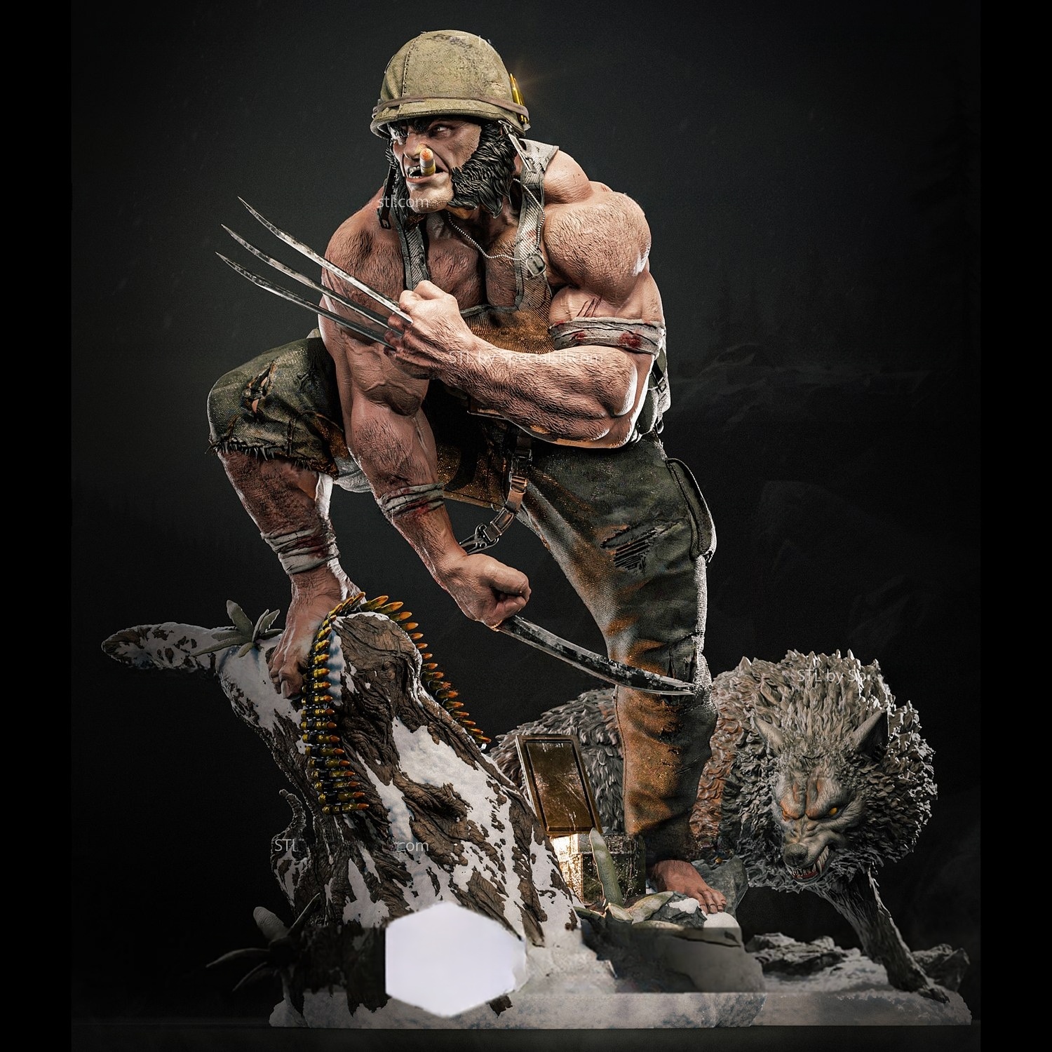 Το σκηνικό της βάσης γεμάτο φυσίγγια, στρατιωτικά αντικείμενα και πάγο, ενισχύει το αίσθημα έντασης και επιβίωσης. Η λεπτομέρεια στη μυϊκή δομή και το λυκόμορφο βλέμμα του χαρακτήρα προσδίδουν δυναμισμό και κινηματογραφική αισθητική στη φιγούρα.