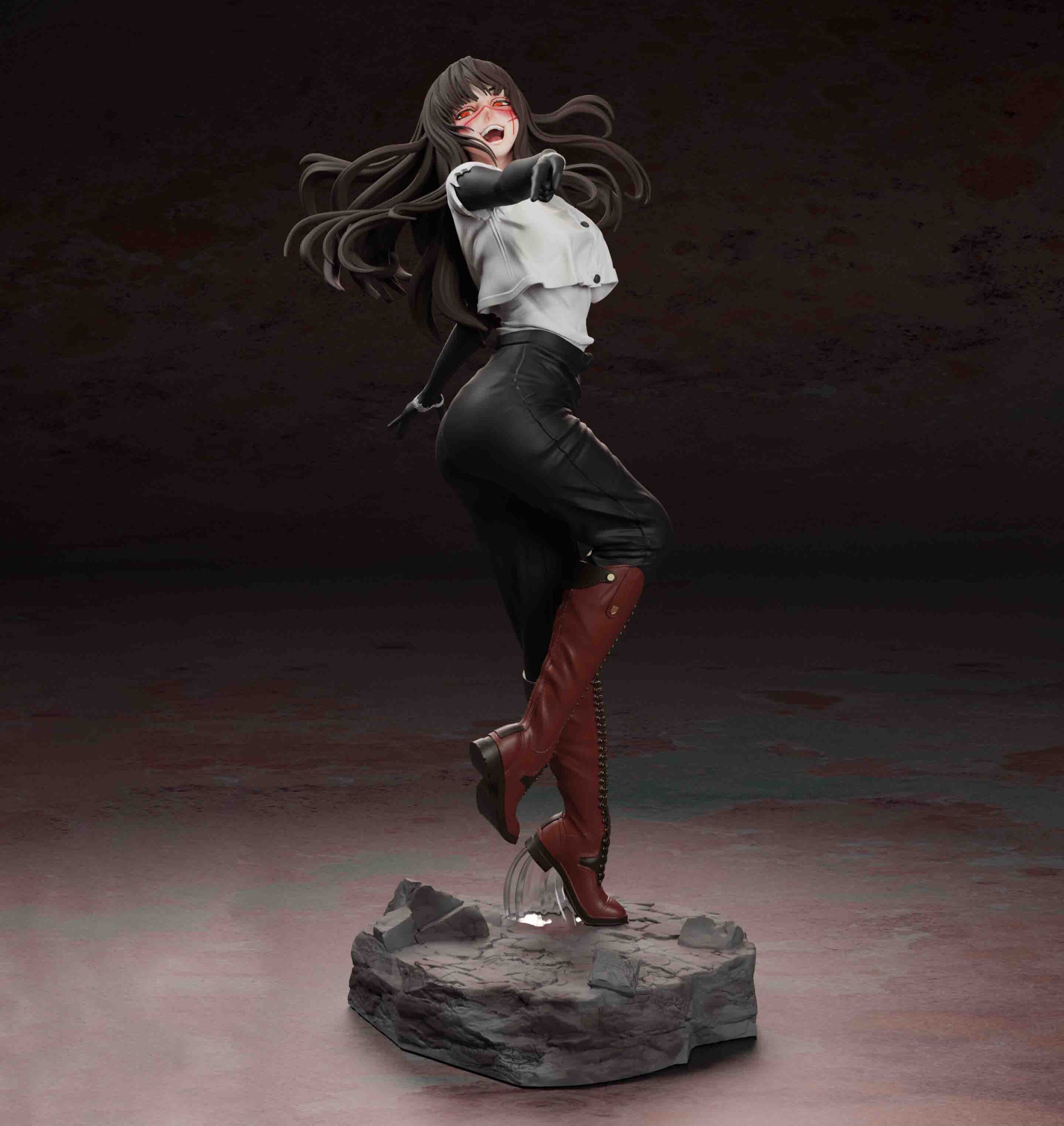 Το δυναμικό πόζαρισμα, τα μακριά μαλλιά που ανεμίζουν ενώ η ένταση στο πρόσωπό της προσθέτουν μια αίσθηση κινηματογραφικής στιγμής κατευθείαν από το Chainsaw Man manga/anime. Η λεπτομέρεια στη στολή, οι μπότες καθώς και η βάση που θυμίζει πεδίο μάχης αποδίδονται με ρεαλισμό και σκοτεινή αισθητική.